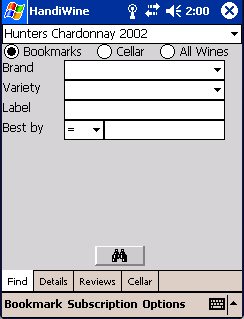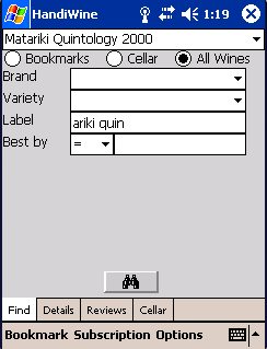 After verifying the database HandiWine displays the ‘Find’ screen and shows wines that have been previously book marked. If no wines are book marked the list at the top of the screen will show ‘New’. On the ‘Find’ screen ‘New’ is synonymous with ‘Nothing Found’. To add a new bookmark select ‘Bookmark’ (bottom left of screen) ‘Add’. To remove an existing book mark select ‘Bookmark’ ‘Remove’. To remove all book marks select ‘Bookmark’ ‘Remove All’. |