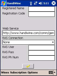 When you subscribe to HandiWine updates you will receive and ‘Application Id’ which is entered in on the ‘Options’ ‘Subscription Settings’ screen. You should verify that your Pocket PC has internet access using ‘Pocket Internet Explorer’ before trying to use the subscription service. Once subscribed to the subscription service you can download updates anytime and as often as you like. |
