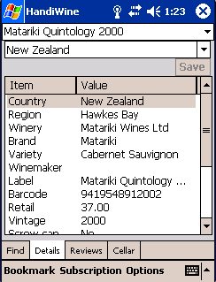 To view a wines details go to the details screen. This lists the wines detailed information. By selecting an item of interest the information will be displayed near the top of the screen. To edit the wine details, simply edit the text showing the detail information. When the text is changed the ‘Save’ button will become available to save your changes. Nothing is saved until the ‘Save’ button is pressed. If you make changes and then select another wine you will be asked if you want to save your changes. |