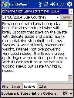 From the ‘Options’ menu, select ‘Subscriptions Settings’ and enter your name in the ‘Personal Id’ field. This name is used when you enter you personal wine reviews. If you purchase the optional subscription you will be provided with an ‘Application Id’ to enable the subscription. You should ensure that your Pocket PC has access to the internet by using ‘Pocket Internet Explorer’ before trying to use the ‘Subscription’ option. |