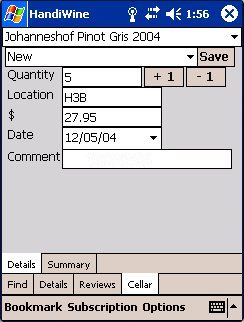 Subscription Settings: This is where you enter the subscription ‘Application Id’, your name in ‘personal Id’ for reviews you enter and how you want your Pocket PC to connect to the internet. Under most circumstances the ‘RAS Connection’ should be set to none. Search Settings: This is where you can change how you find wines on the ‘Find’ screen. Backup: This makes a copy of your HandiWine data to ROM or removable storage. A backup is automatically done before updating using the subscription service. In the event that you Pocket PC device is ‘Cold Booted’ your backed up HandiWine data can be restored. Restore: Restore is used to recover your backed up HandiWine data. This option is not available if HandiWine cannot find the backed up data. You can use this to restore HandiWine data after reinstalling HandiWine. Upload Cellar: When this option is selected your wine cellar information will be backed up to HandiWine.com when using your subscription. To turn this off, select ‘Upload Cellar’ again. Auto SIP: SIP is the Pocket PC Soft Input Panel, the small keyboard that appears across the bottom of the screen. Turning this option on will make the SIP appear whenever you can type text. Keyboard: When selected, this displays a larger full screen keyboard. This option is only available when you can type text in. Exit: Selecting this option exits the application. You do not normally need to do this because your Pocket PC will stop HandiWine if necessary when it isn’t in use. |